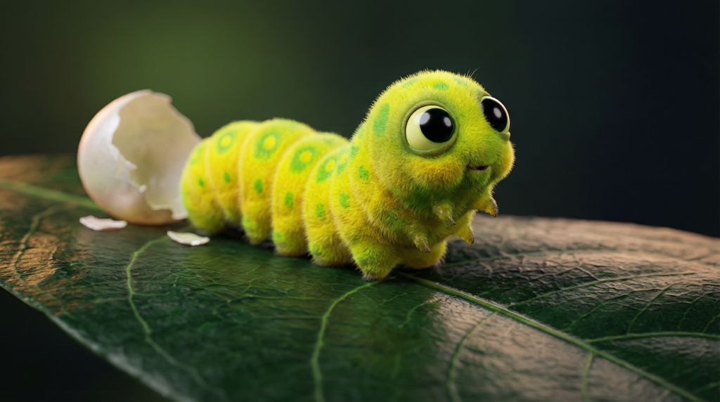 ”Milo is the Meadow’s hungriest little explorer. He spent his very first morning nibbling his way out of his tiny eggshell, and he hasn’t stopped snacking since! He loves tasting every leaf in the Meadow, searching for the perfect spot to one day build his cozy emerald cocoon.”